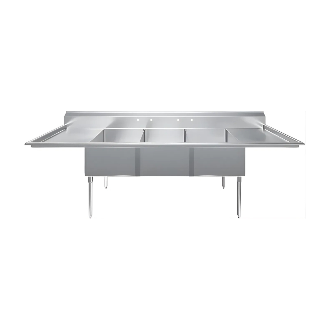 The triple bowl configuration (24″ x 24″ x 14″ each) supports a smooth wash–rinse–sanitize workflow, while also offering ample space for large cookware, utensils, and prep tasks.