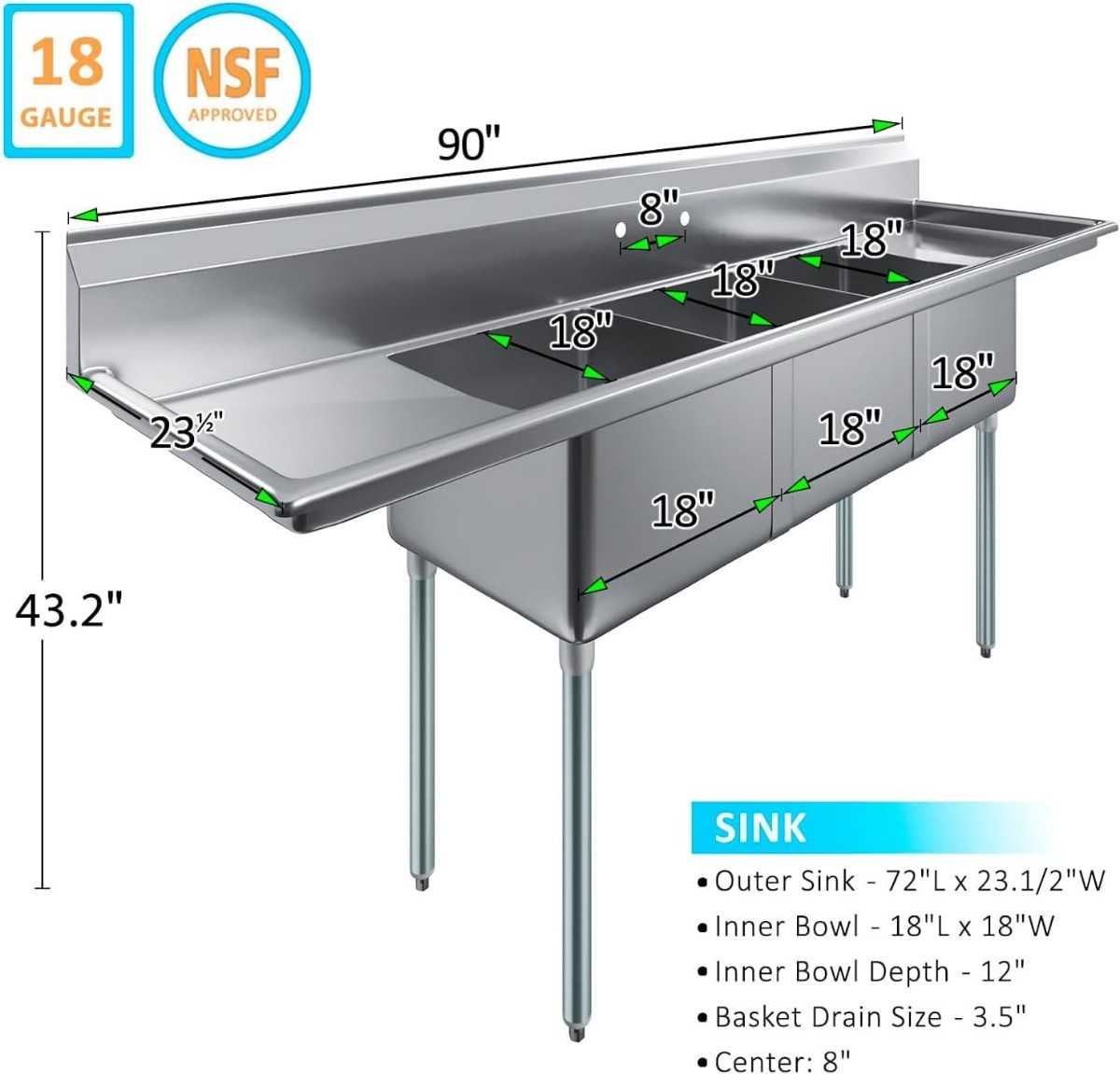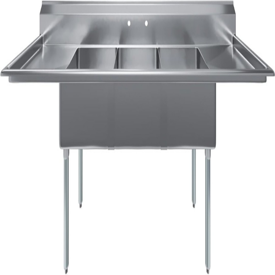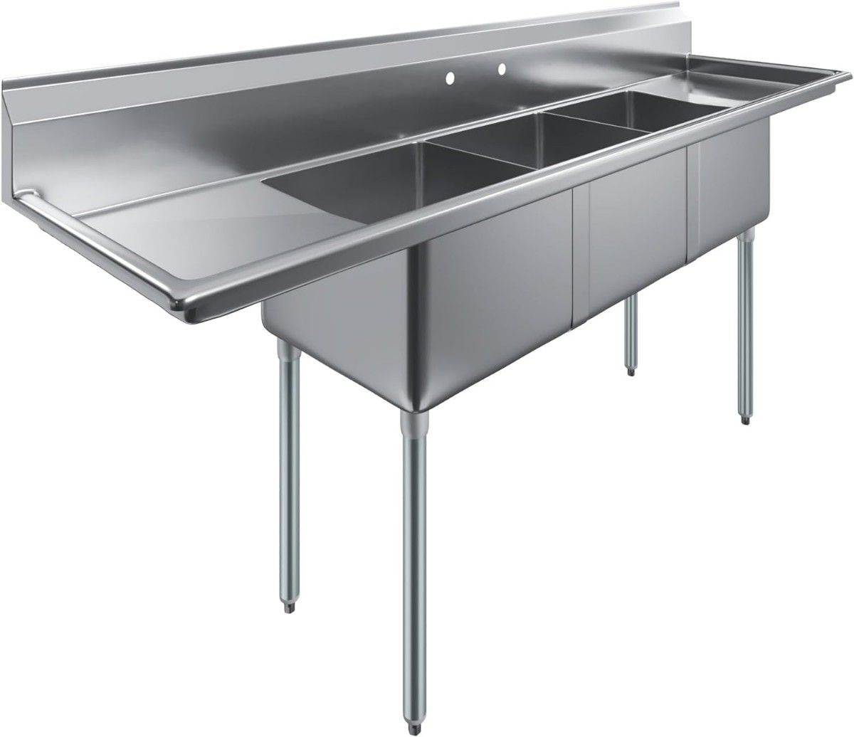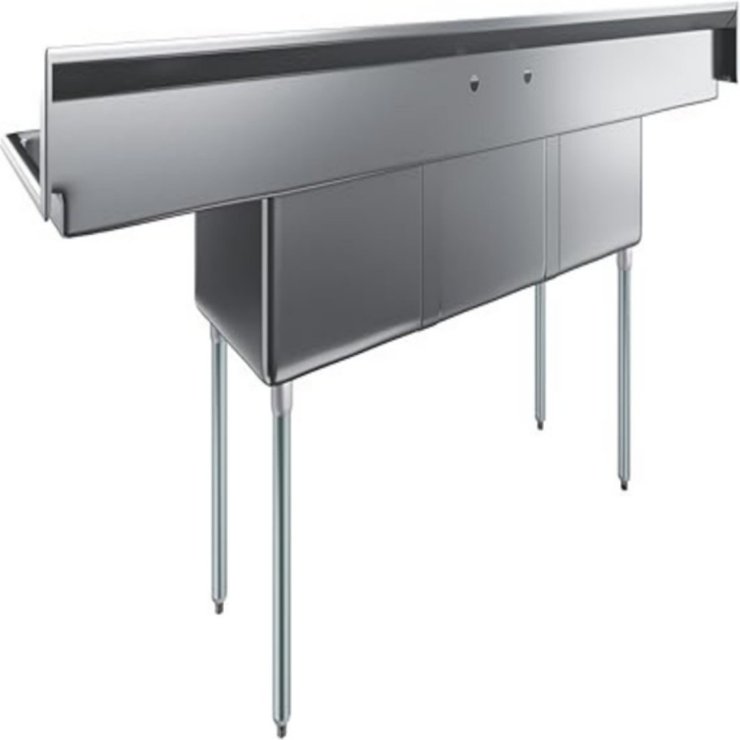 Spanning a massive 23 in. x 90 in., this sink features three bowls for a dedicated wash, rinse, and sanitize workflow. The addition of 2 drainboards on either side provides extra space for drying or food preparation, significantly boosting efficiency. As an NSF Certified unit, it meets the highest standards for public health and safety. The heavy-duty construction is complemented by an integrated backsplash that protects your walls, while adjustable bullet feet ensure the sink remains perfectly level on any floor surface.