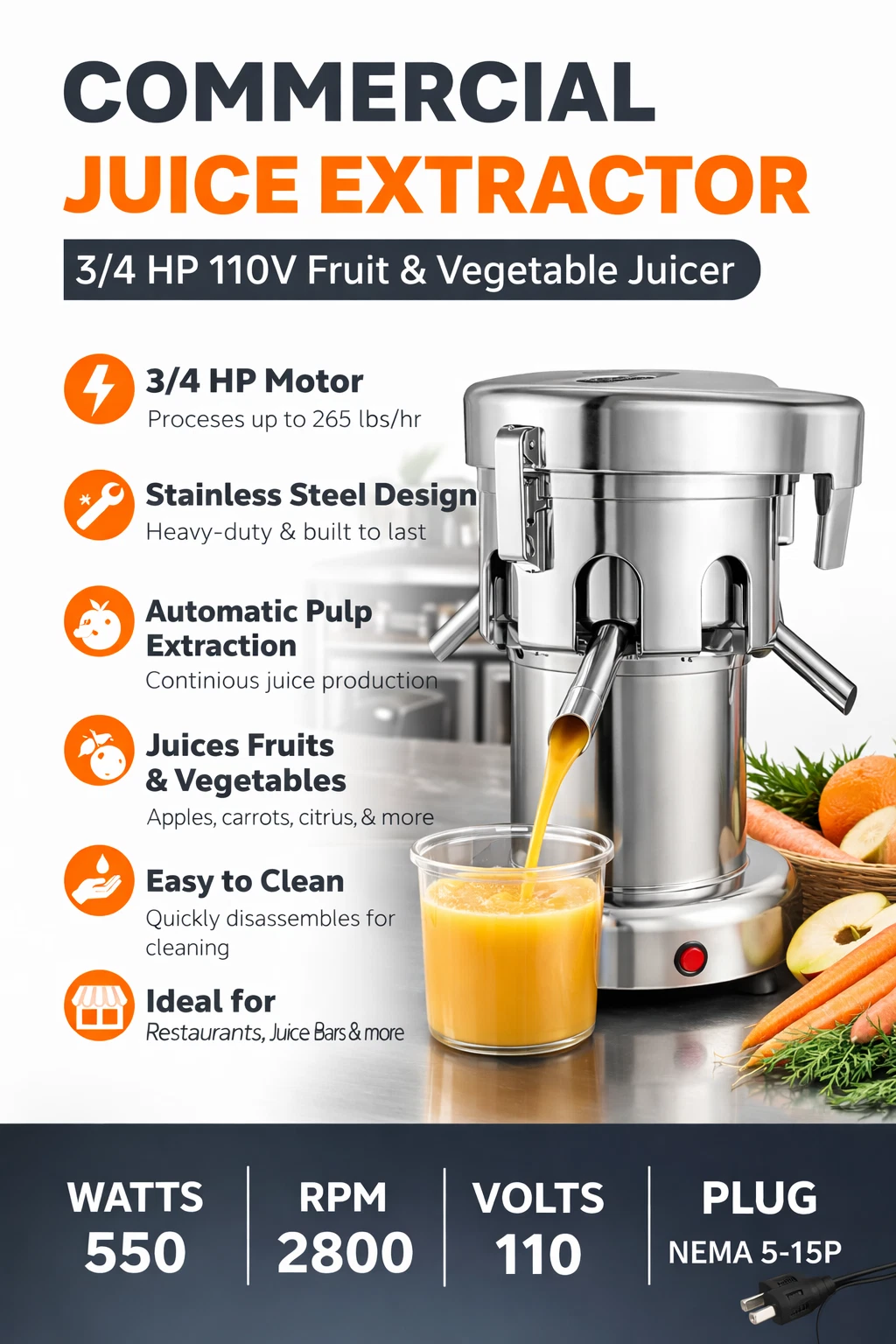 Commercial Juice Extractor – 3/4 HP Stainless Steel Juicer, 110V for Fruits & Vegetables