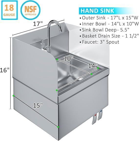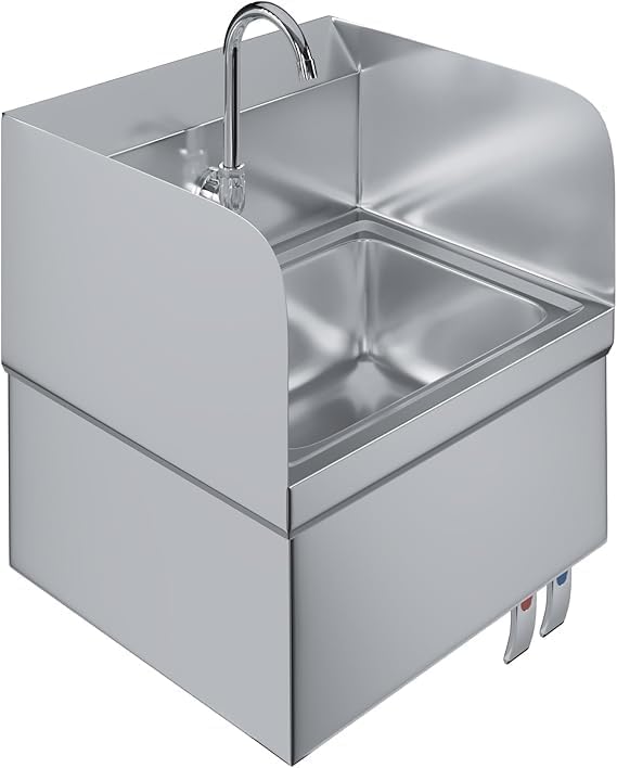 Commercial Stainless Steel Wall-Mount Hand Sink with Side Splash with Knee Pedals – Dimensions 15″x17″