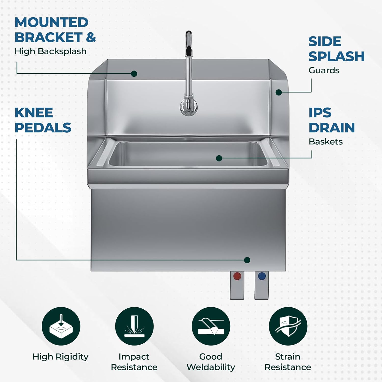 This Commercial Wall-Mount Hand Sink features knee pedals that allow for hands-free operation, enhancing hygiene and reducing cross-contamination risks. By simply pressing the knee pedals, users can activate hot and cold water without touching the faucet, making it ideal for commercial kitchens, healthcare facilities, and food service operations where sanitation is a priority.