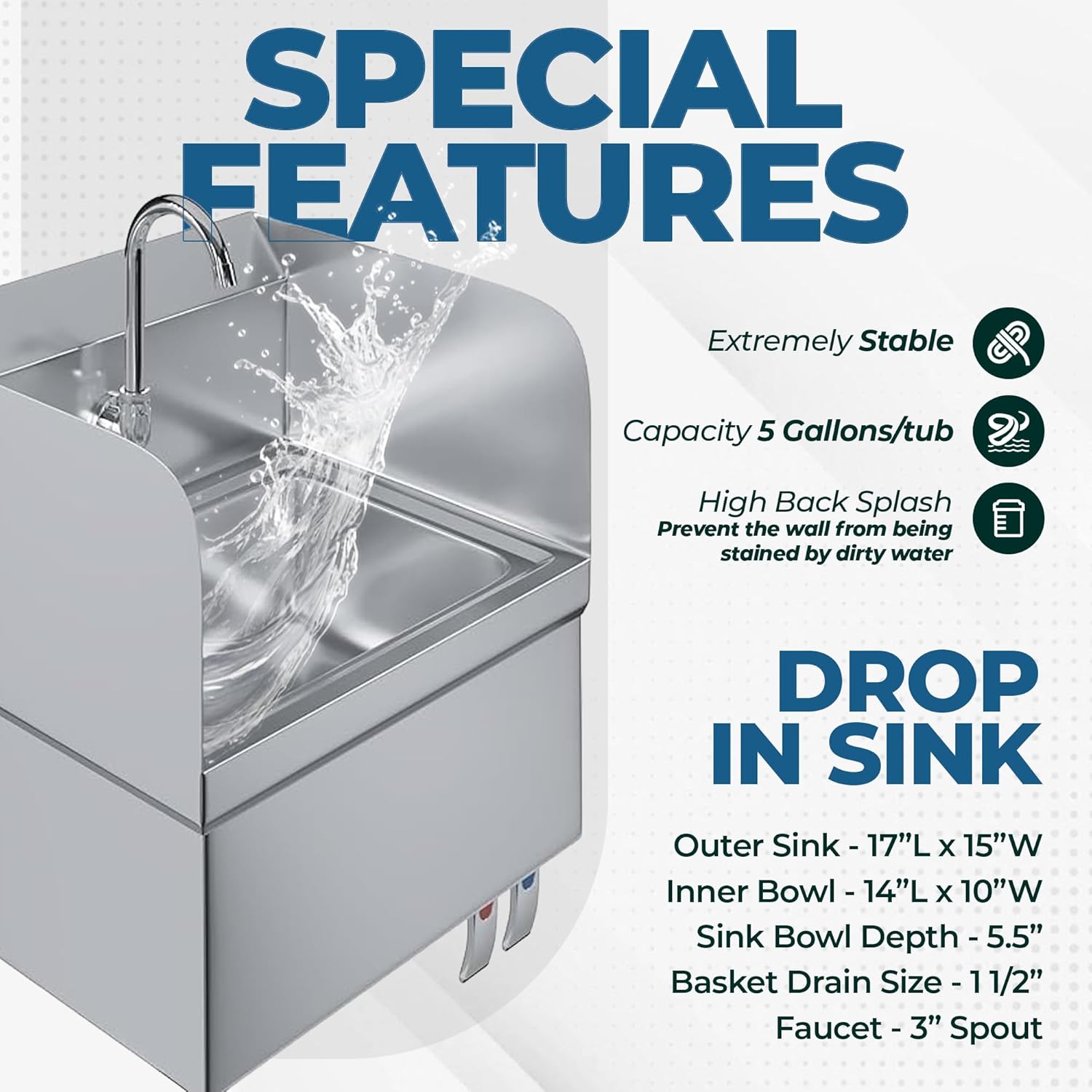 The included gooseneck faucet enhances the Commercial Wall-Mount Hand Sink by providing extended reach and clearance. Its tall, curved design ensures that users have ample space for comfortable handwashing, accommodating various tasks in restaurant kitchens, healthcare facilities, and food preparation areas. This high-quality faucet also helps reduce splashing, keeping the surrounding area dry and clean.