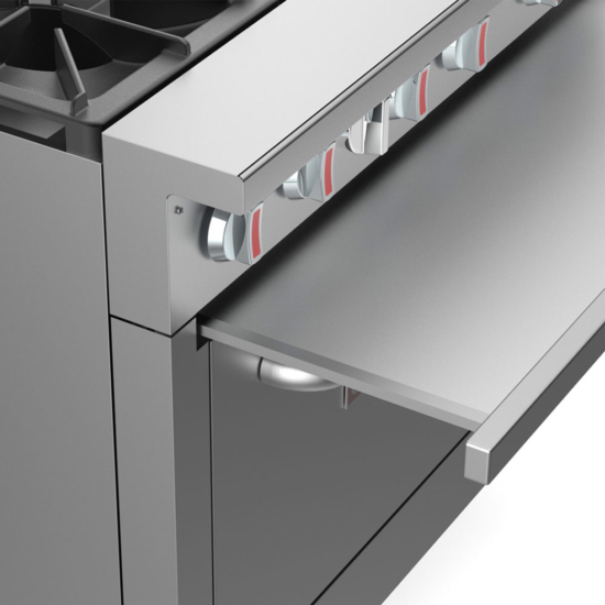 This commercial range is designed to simplify daily kitchen maintenance. A pull-out crumb tray located beneath the burners collects loose ingredients, spills, and food debris to keep the cooking area cleaner throughout the day.