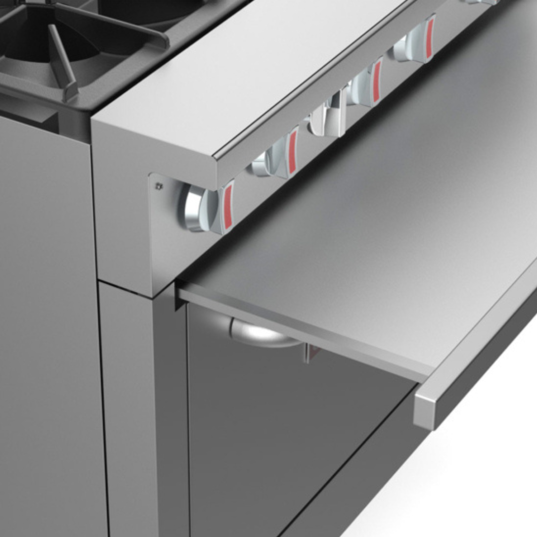 The built-in convection oven is ideal for warming foods, baking desserts, roasting dishes, or preparing baked goods. A thermocouple safety system ensures operation only when the pilot light is active, providing an added layer of safety in busy kitchens.
