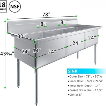 Overall size 22.5″ x 18″ x 33″ with 3″ backsplash Bowl Size 14″ x 10″ x 7″ for Sink Made from heavy-duty 18-gauge 304 stainless steel with a 20-gauge hat channel and apron for long-lasting strength and corrosion resistance. Includes 6″ swing nozzle faucet removable drainboard with glass rinser dipper well with faucet copper drain…