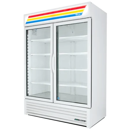 True GDM-41-HC-LD Two-Section Glass Door Merchandiser offers efficient 33–38°F cooling with R290 refrigerant, LED lighting, and double-pane glass doors—ideal for high-visibility refrigerated display.