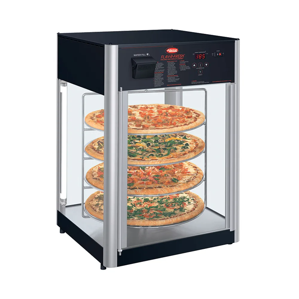 The Hatco FDWD-1 Rotating Heated Pizza Merchandiser Flav-R-Fresh® countertop holding and display case uses separate controls for heat and humidity to keep product fresh while showcasing it. Its door and sides are made of tempered glass, so food is readily visible for guests, while a fluorescent light in the cabinet enhances visibility. This Hatco FDWD-1 Rotating Heated Pizza Merchandiser Flav-R-Fresh countertop holding and display case has a four-tier rack that can accommodate pretzels, hot dogs, pizzas as big as 15 inches diameter, or other popular foods in stores, concession stands, and snack bars.