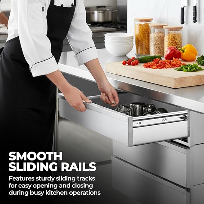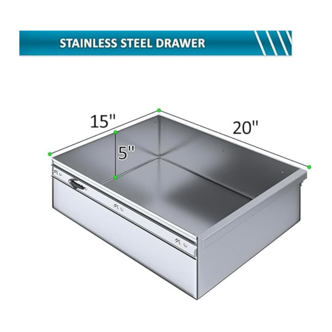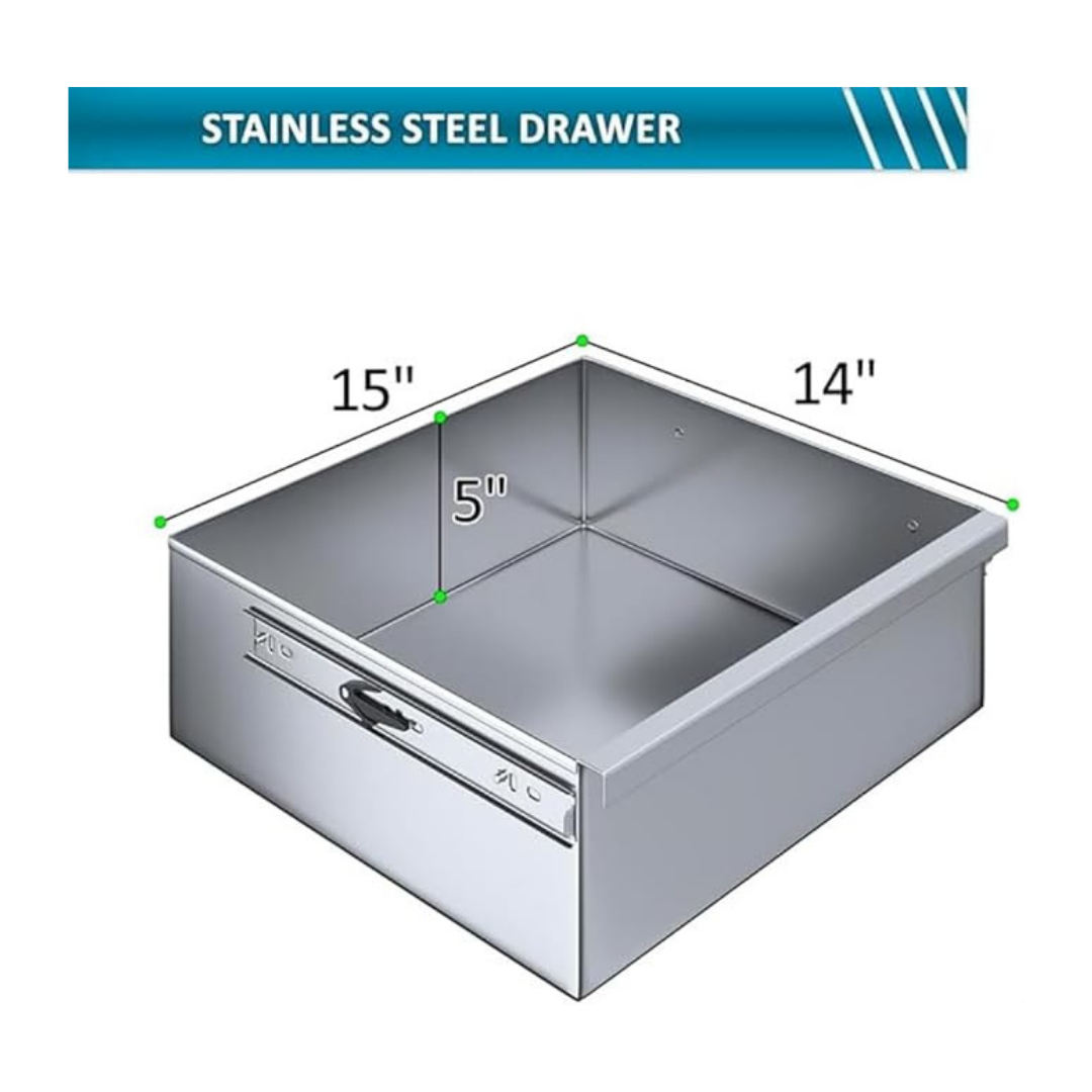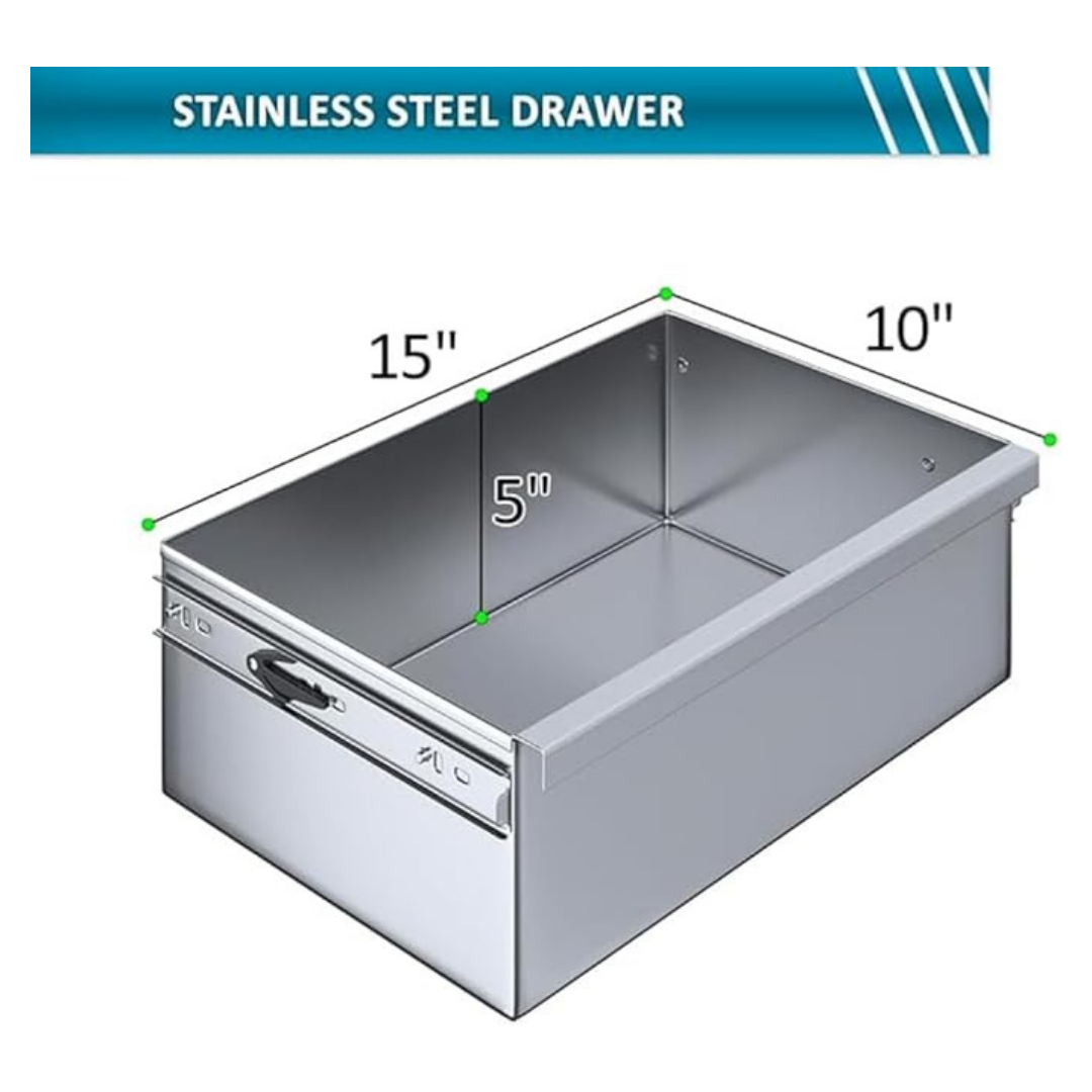 Constructed from heavy-duty 18-gauge stainless steel, the drawer is built to handle daily use in demanding environments such as commercial kitchens, food trucks, garages, and utility workstations. Its smooth-sliding rail system allows quick, easy access to utensils, tools, or small supplies during busy operations.