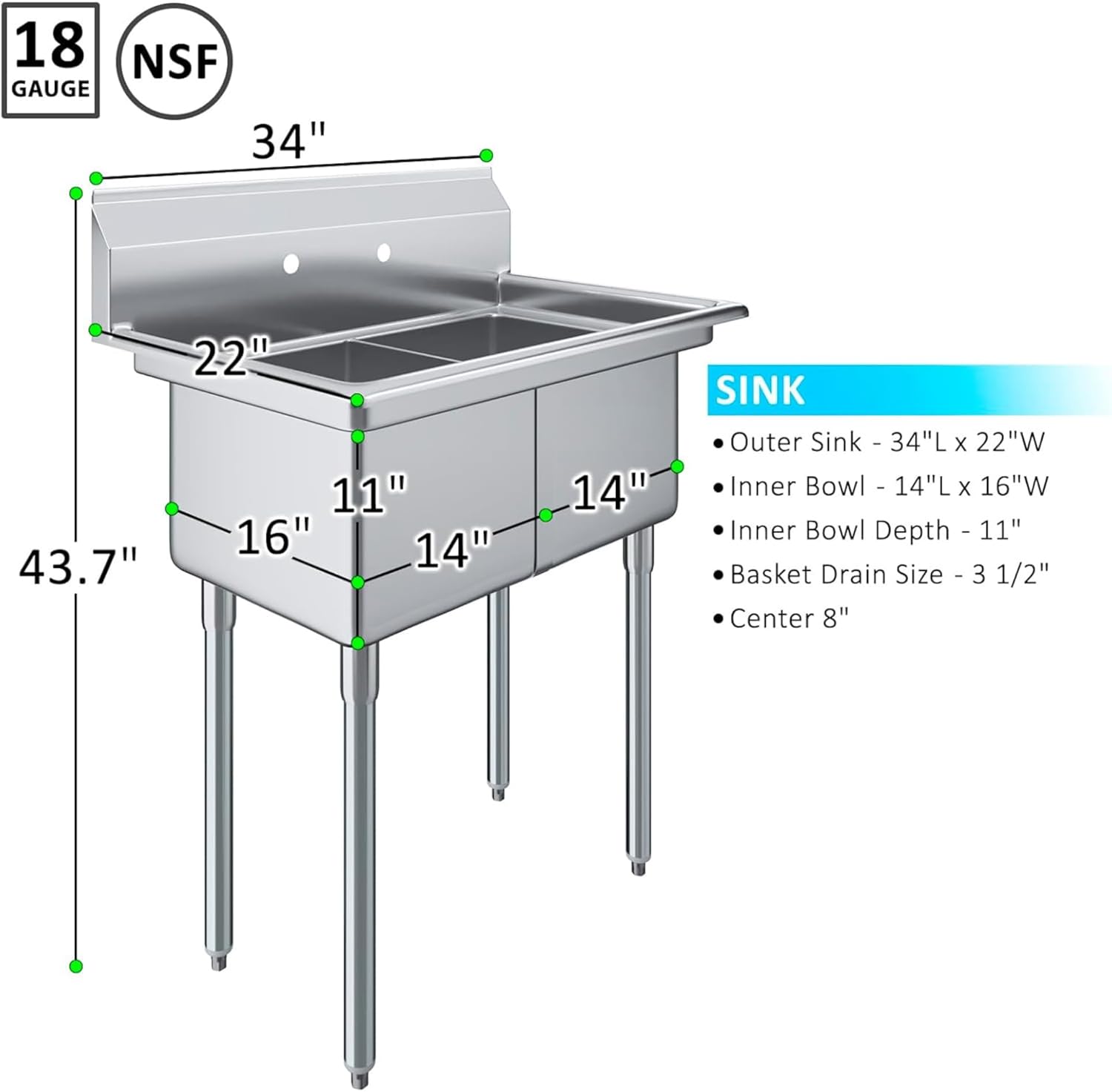 | Bowl Dimensions | 14 in. x 16 in. x 11 in. (Per Basin) |