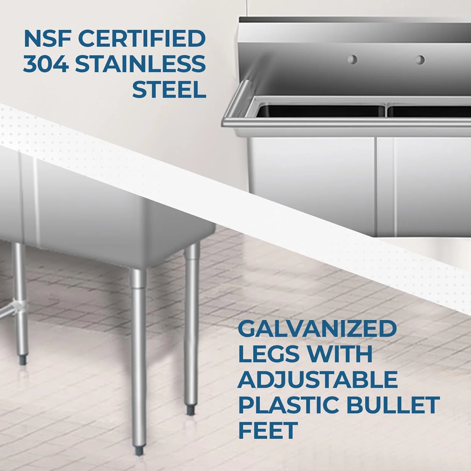 Built for longevity, the heavy-duty stainless steel construction is naturally corrosion resistant, making it ideal for wet and humid environments. The space-saving design fits perfectly into smaller layouts while the integrated backsplash protects your walls from water damage and maintains high hygiene standards. Supported by sturdy legs with adjustable bullet feet, this NSF Certified style sink ensures stability and meets professional safety requirements for food service and industrial use.