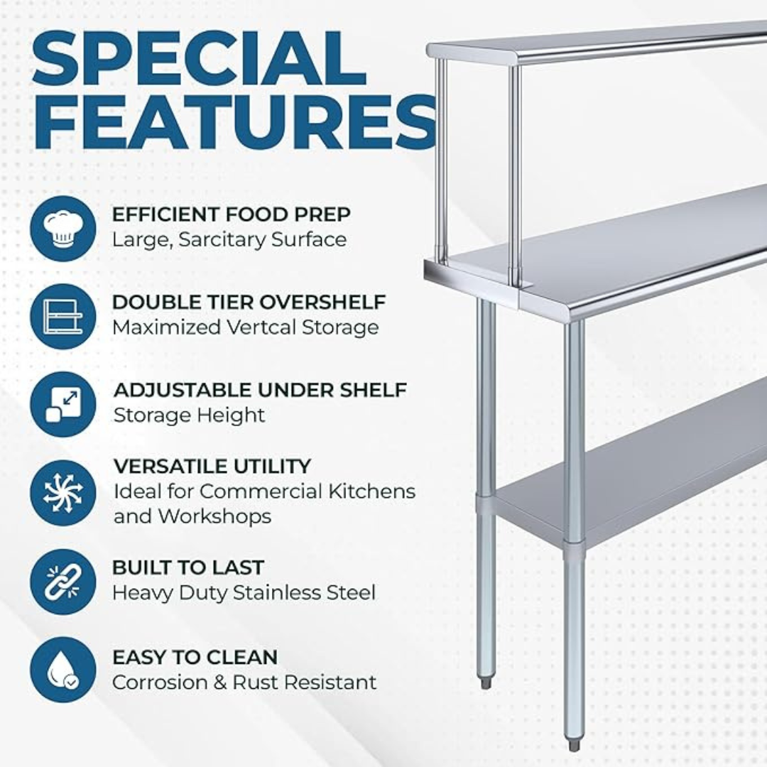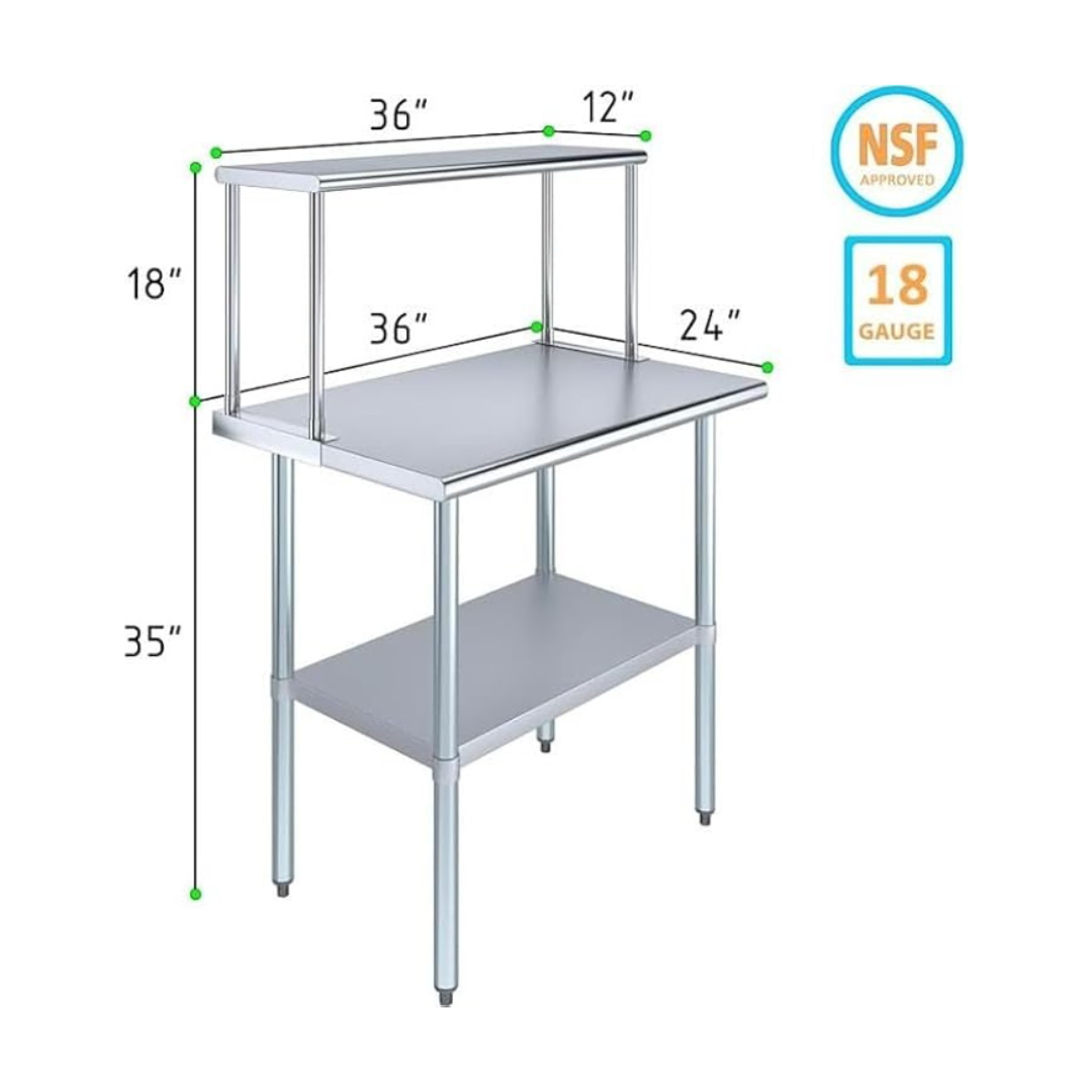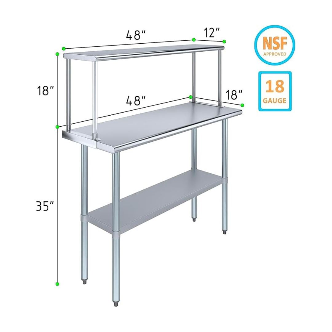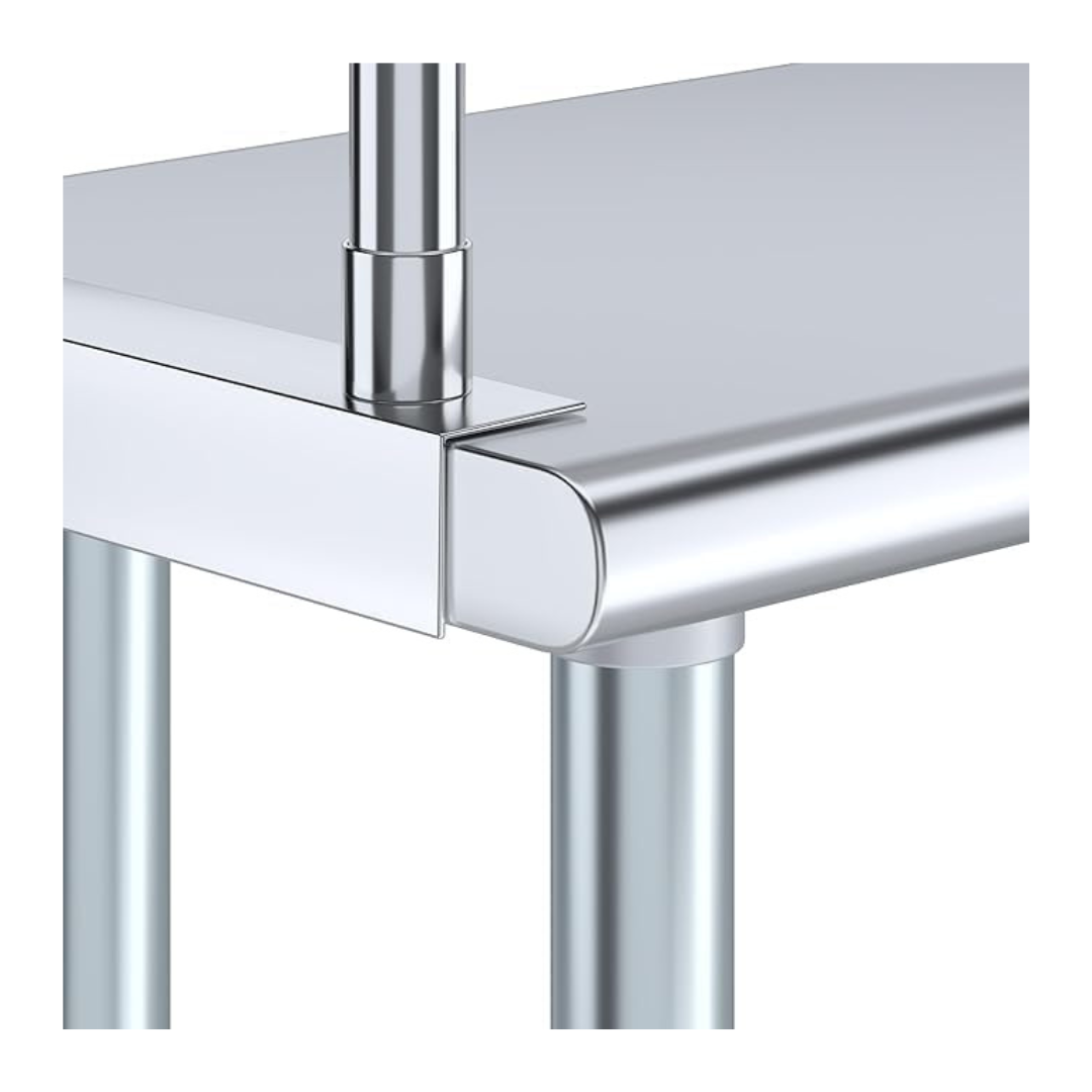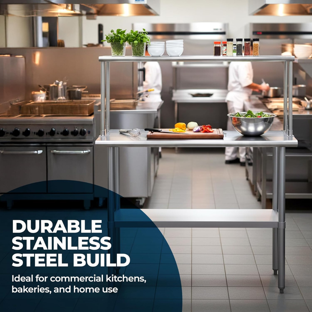 The stainless steel tabletop offers ample room for chopping, mixing, and assembling dishes. The integrated single-tier overshelf provides convenient vertical storage, allowing you to keep spices, utensils, containers, and frequently used kitchen tools within easy reach while maintaining a clutter-free work area.