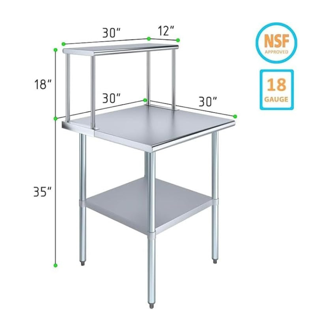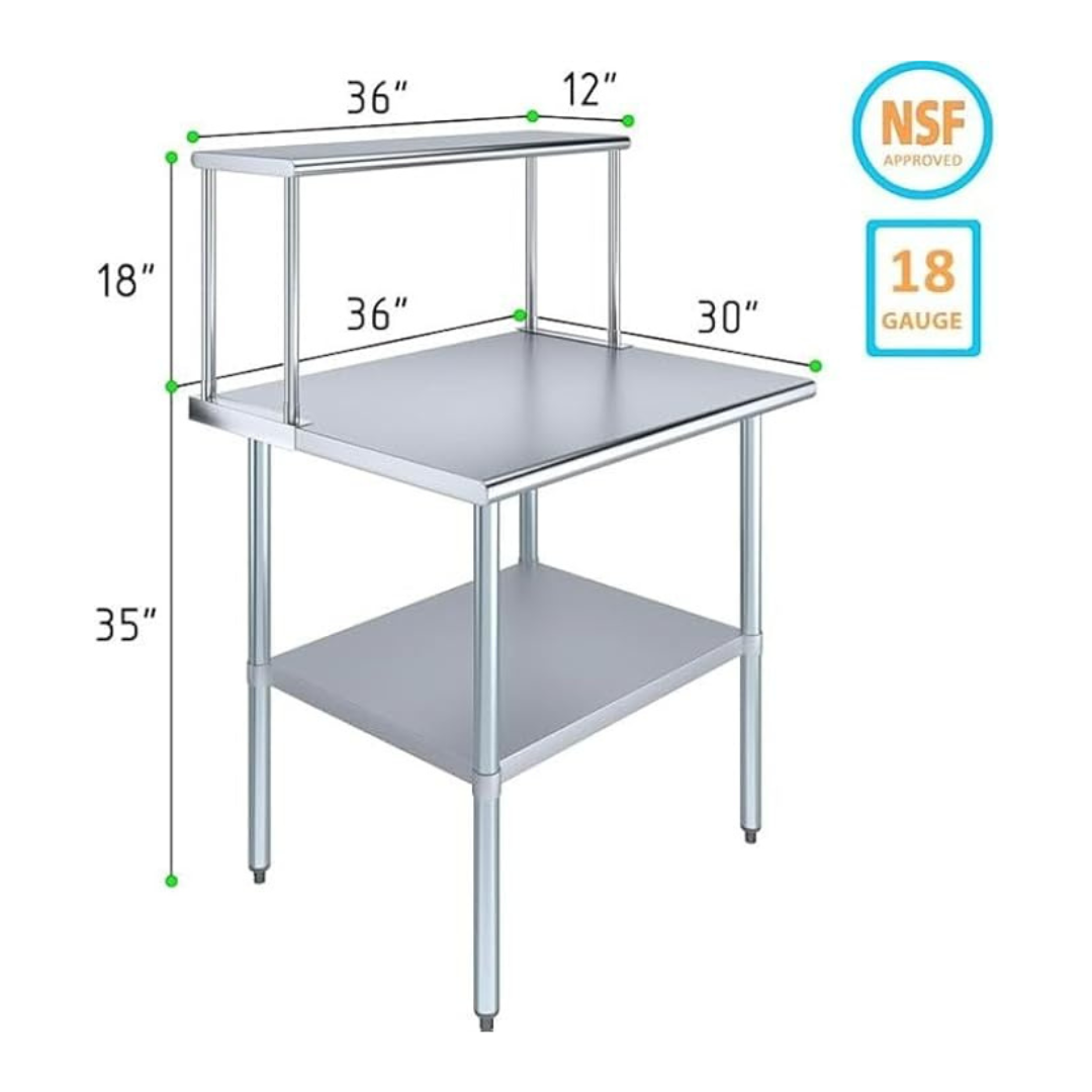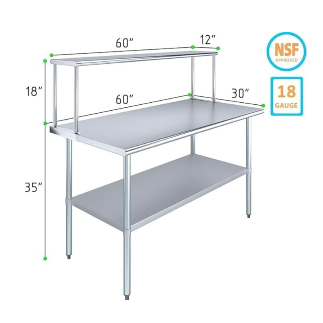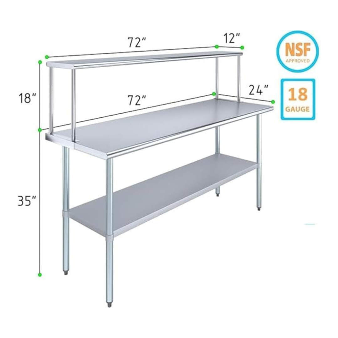 The stainless steel tabletop offers ample room for chopping, mixing, and assembling dishes. The integrated single-tier overshelf provides convenient vertical storage, allowing you to keep spices, utensils, containers, and frequently used kitchen tools within easy reach while maintaining a clutter-free work area.