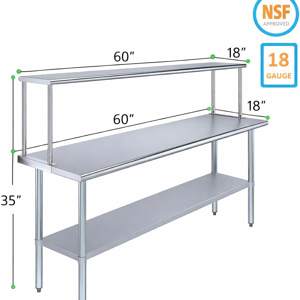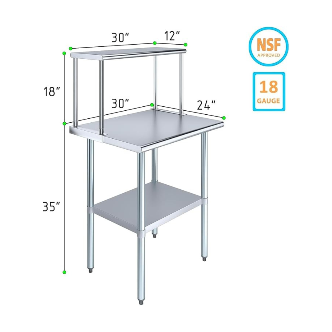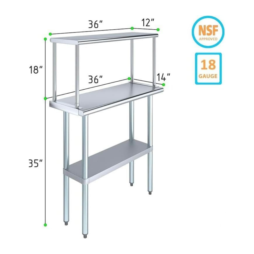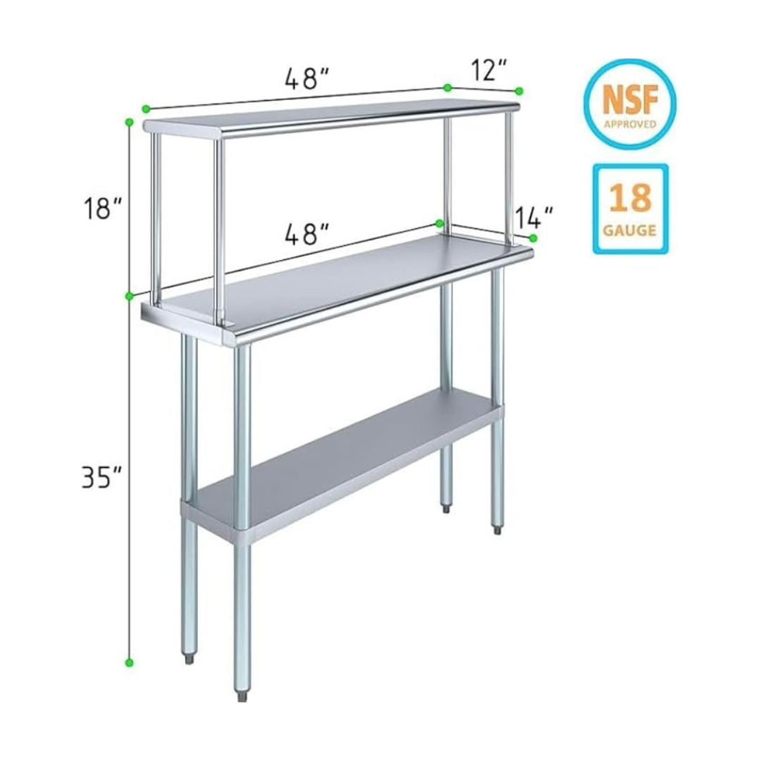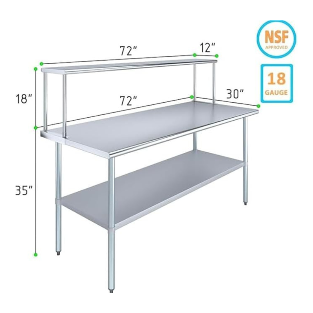 The stainless steel tabletop offers ample room for chopping, mixing, and assembling dishes. The integrated single-tier overshelf provides convenient vertical storage, allowing you to keep spices, utensils, containers, and frequently used kitchen tools within easy reach while maintaining a clutter-free work area.