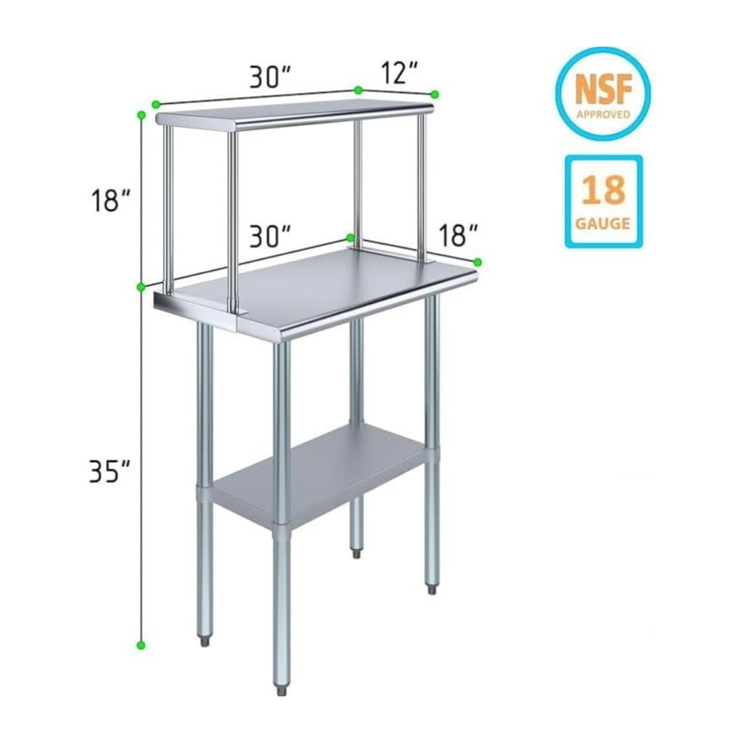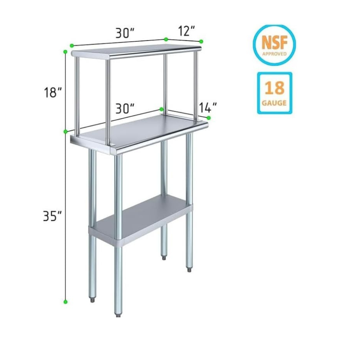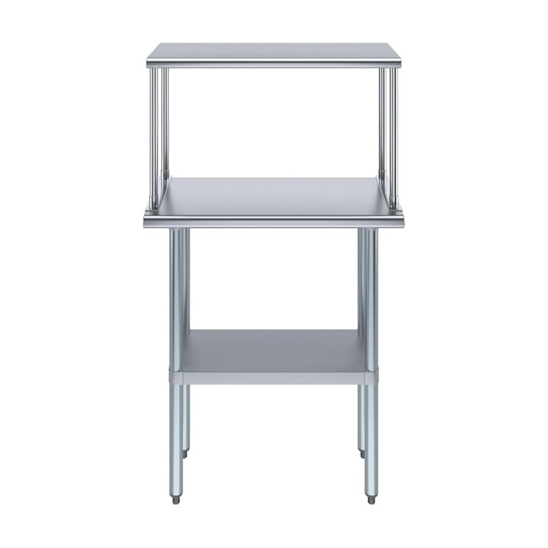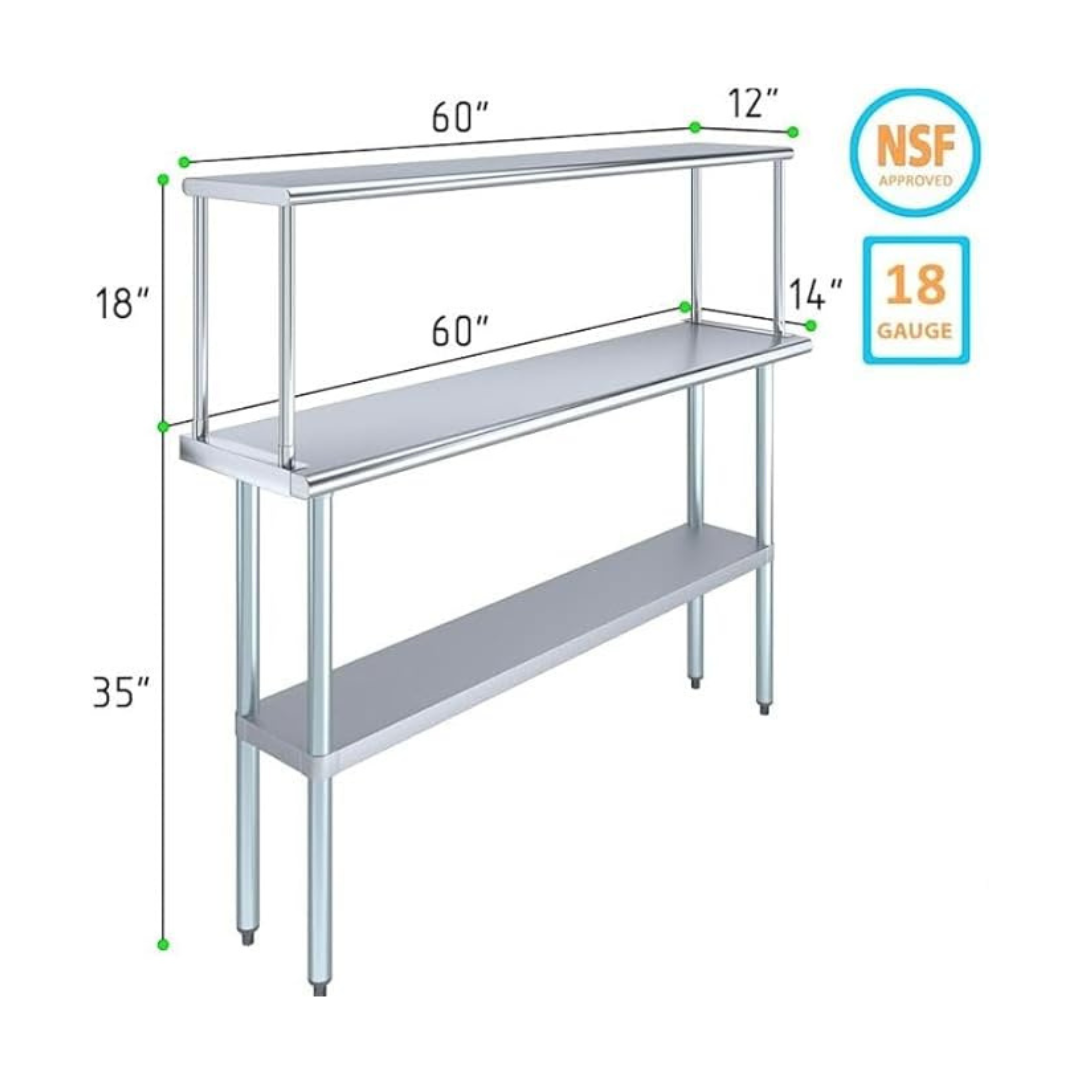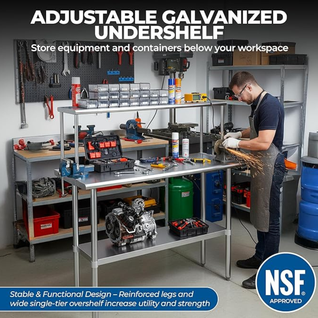 The stainless steel tabletop offers ample room for chopping, mixing, and assembling dishes. The integrated single-tier overshelf provides convenient vertical storage, allowing you to keep spices, utensils, containers, and frequently used kitchen tools within easy reach while maintaining a clutter-free work area.