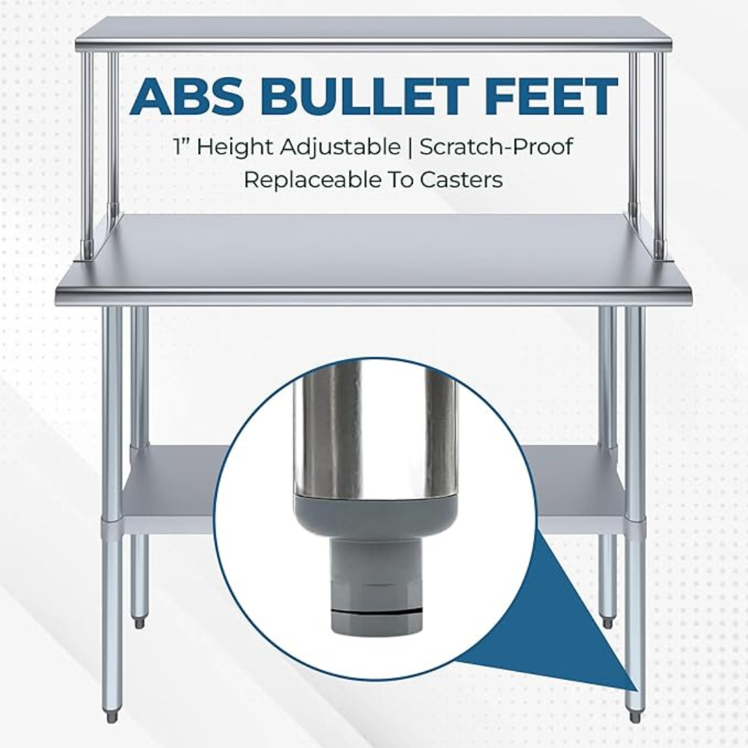 Designed for stability, the table features adjustable bullet feet that allow you to level the unit on uneven floors. This ensures a steady work surface for safe and efficient food preparation.