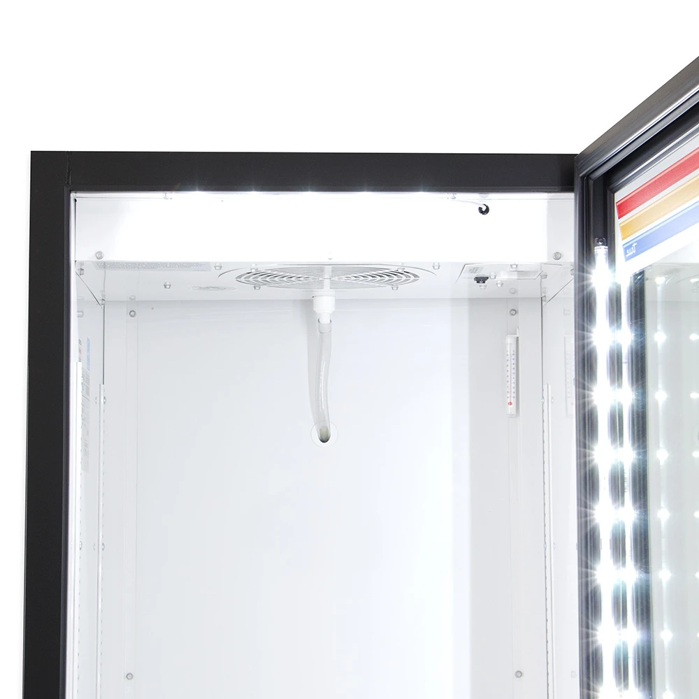 For long-term durability, the exterior is finished in black powder-coated steel that resists chipping and wear, while the interior features a white aluminum liner paired with a stainless steel floor. A built-in floor drain simplifies interior cleaning, making routine maintenance faster and more efficient. The epoxy-coated evaporator provides added corrosion resistance, extending the lifespan of the refrigeration system.
