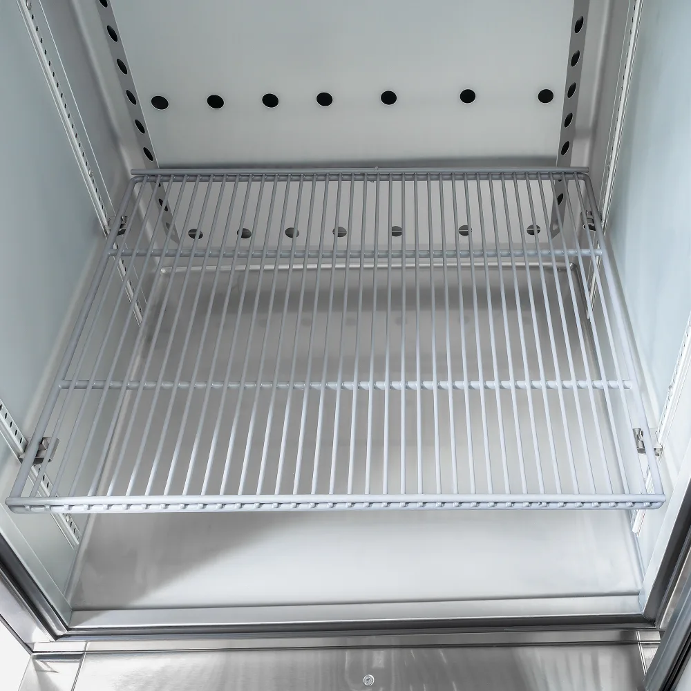 Inside the cabinet, three adjustable PVC-coated shelves accommodate a variety of food pans and packaged items. Bright LED interior lighting improves visibility, helping staff quickly locate stored products even during peak service hours. Foamed-in-place polyurethane insulation helps retain cold air, reducing energy loss and supporting consistent cooling.