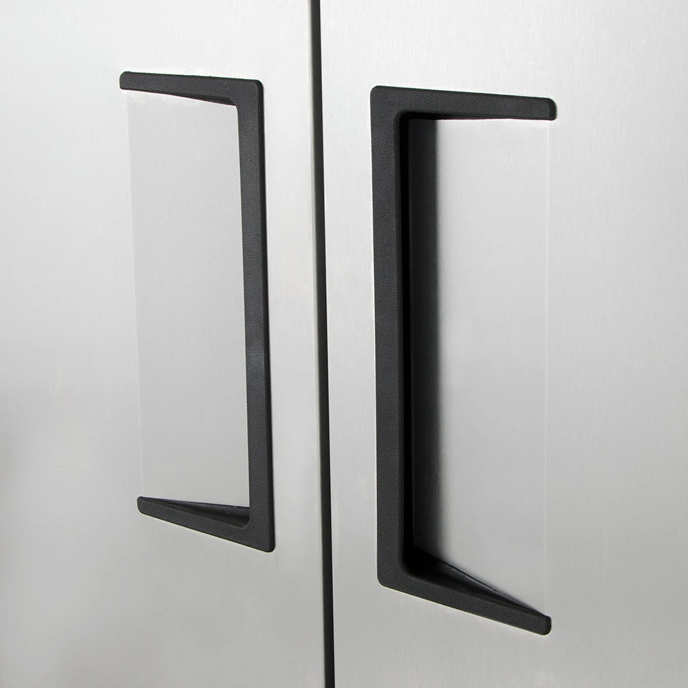 This commercial freezer features two stainless steel doors with tight-sealing magnetic gaskets to minimize cold air loss. The doors are self-closing to help maintain internal temperatures and include 12-inch recessed handles for a sleek, space-saving design. The stainless steel front resists corrosion, while the anodized aluminum ends add extra strength for demanding kitchen environments.