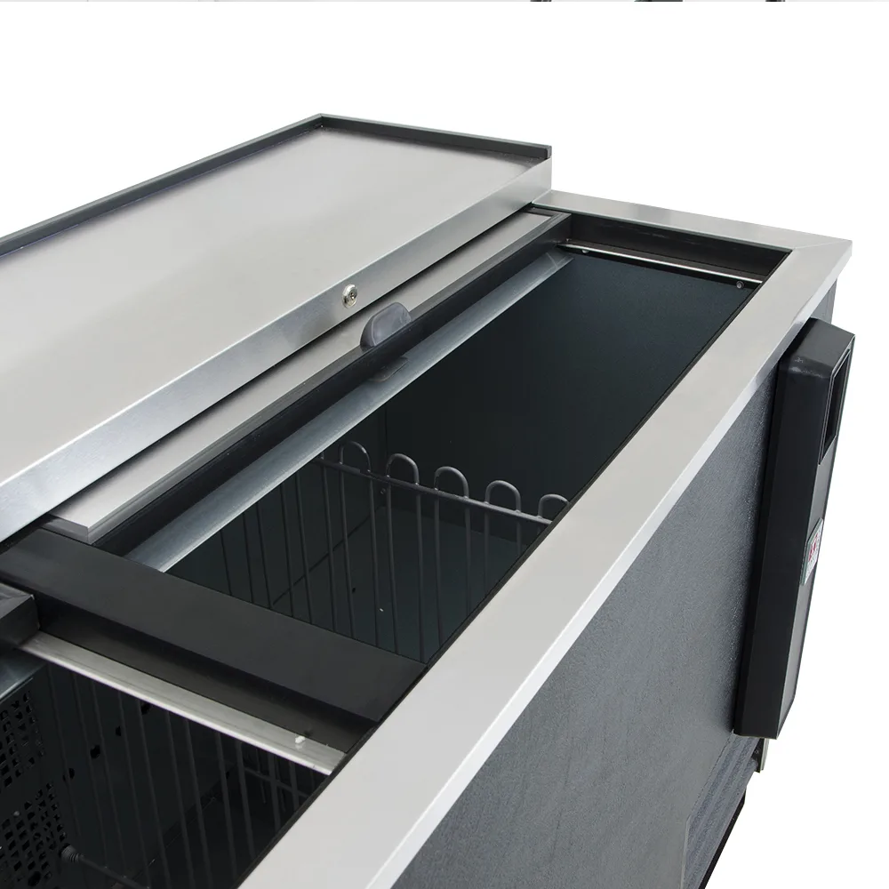 The exterior is built with durable stainless steel for easy cleaning and long-term use in commercial settings. Two sliding lids with integrated barrel locks help protect stored inventory, while foamed-in-place polyurethane insulation minimizes cold-air loss and supports efficient temperature retention. A welded, black powder-coated steel frame rail adds structural strength and corrosion resistance.