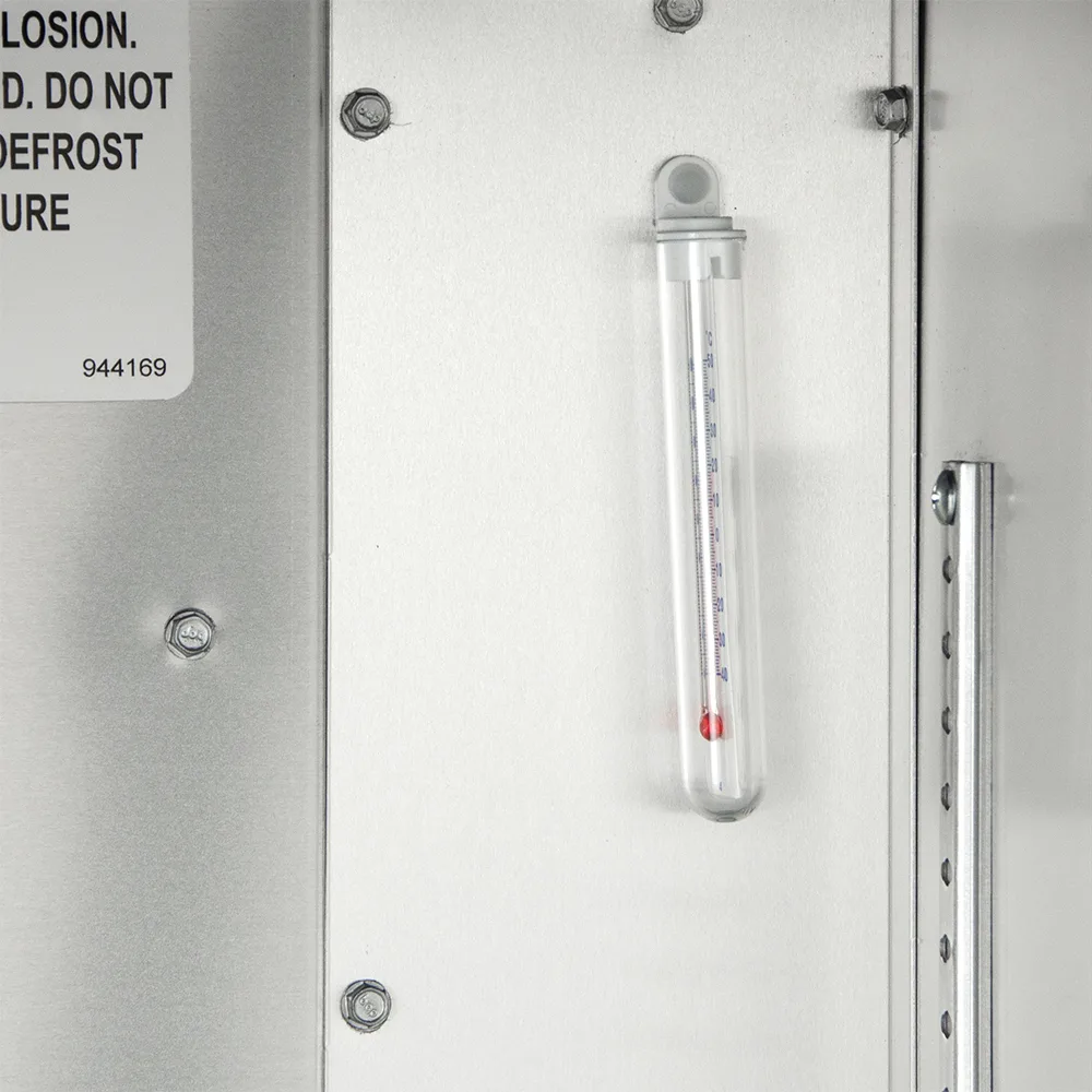 This model uses a self-contained capillary tube refrigeration system with environmentally friendly R290 hydrocarbon refrigerant to maintain an average cabinet temperature of -10°F. A low-velocity, high-volume airflow design, created by the evaporator fan motor and large fan blades, ensures consistent freezing conditions without excessive air turbulence. The rear-accessible refrigeration system allows for quick servicing and reduced downtime.