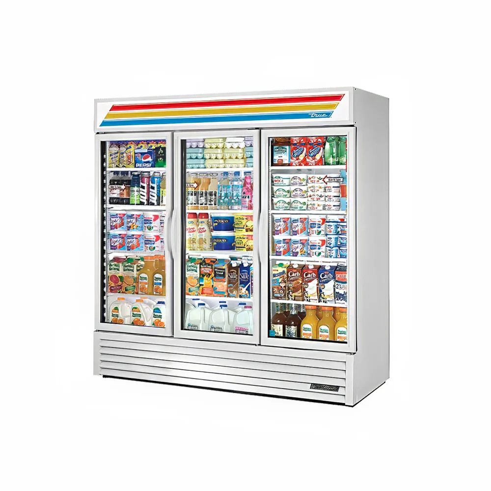 True GDM-72-HC~TSL01 Three-Section Glass Door Merchandiser delivers reliable 33–38°F refrigeration with energy-efficient R290 refrigerant, bright LED lighting, and triple glass doors—ideal for high-capacity, high-visibility refrigerated display.