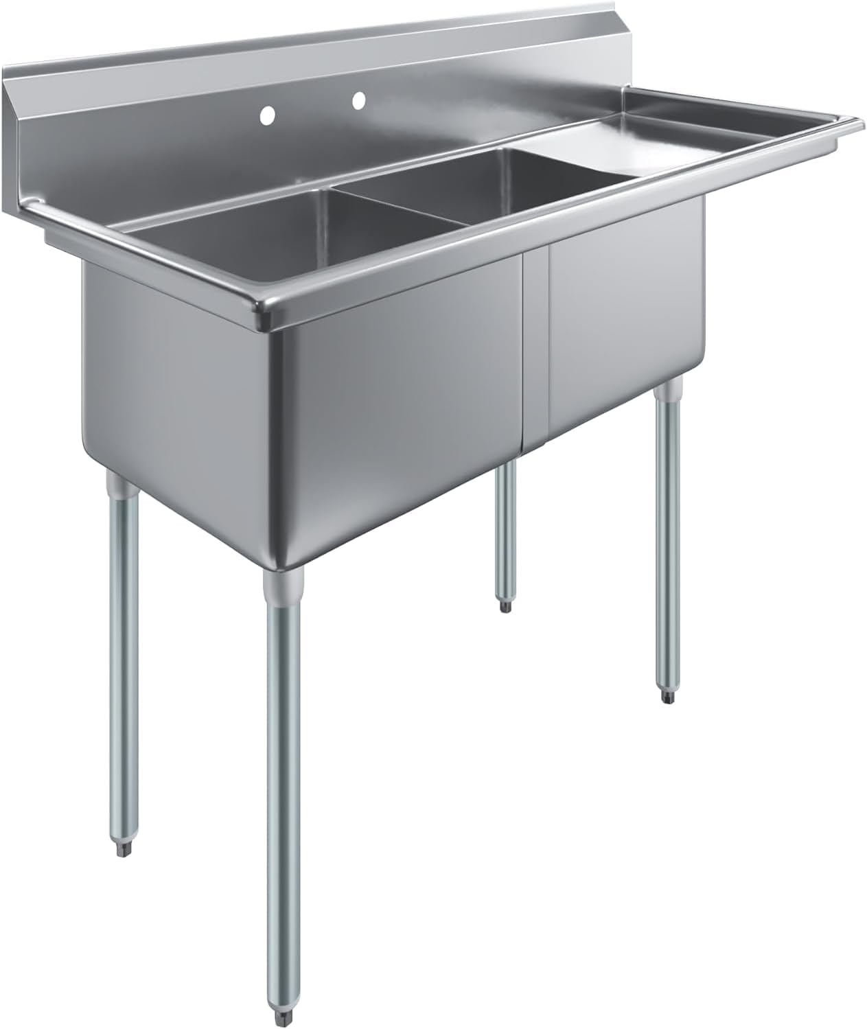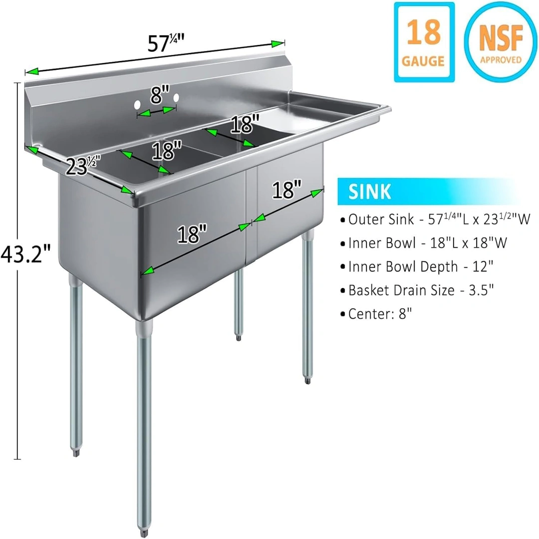 Two compartment stainless steel sink designed for commercial kitchens, restaurants, laundry rooms, garages, and prep areas that require durability and efficiency. The 57″ x 24″ size with right drainboard provides a practical workspace for washing and drying in one streamlined setup.