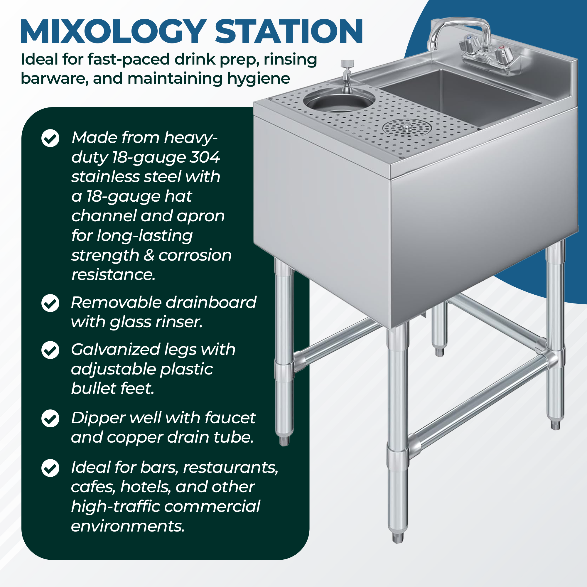 The Underbar Mixology Station is a compact stainless steel bar sink designed to improve efficiency in busy commercial beverage areas. Built for professional bars, restaurants, cafés, and hotels, this unit supports streamlined rinsing, cleaning, and prep tasks while maximizing limited underbar space.
