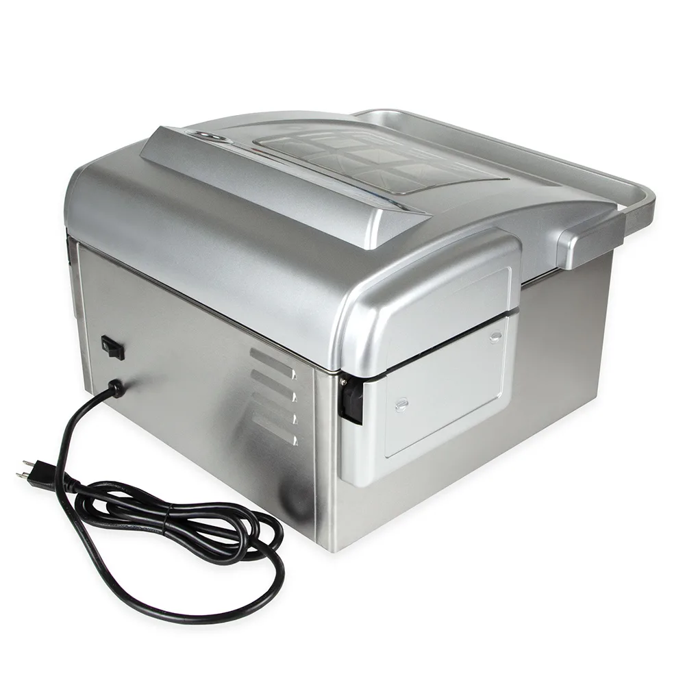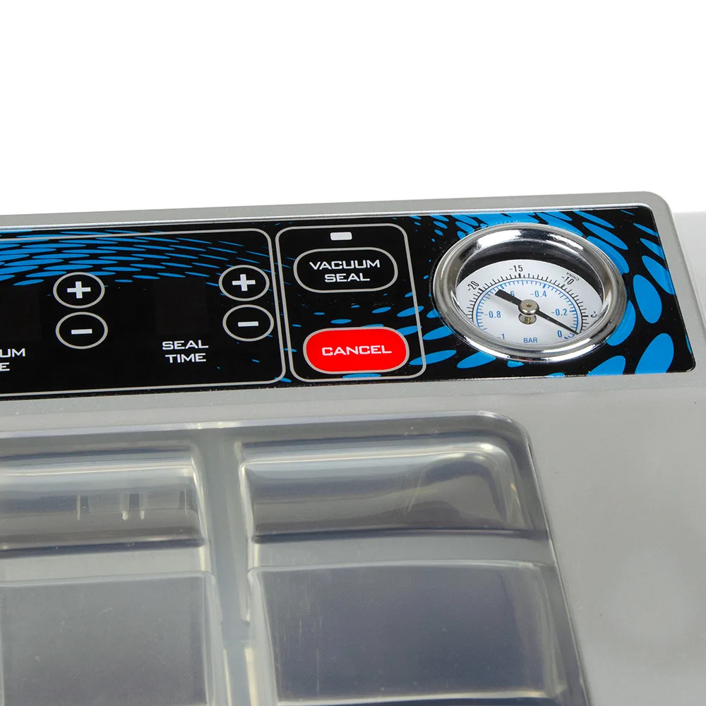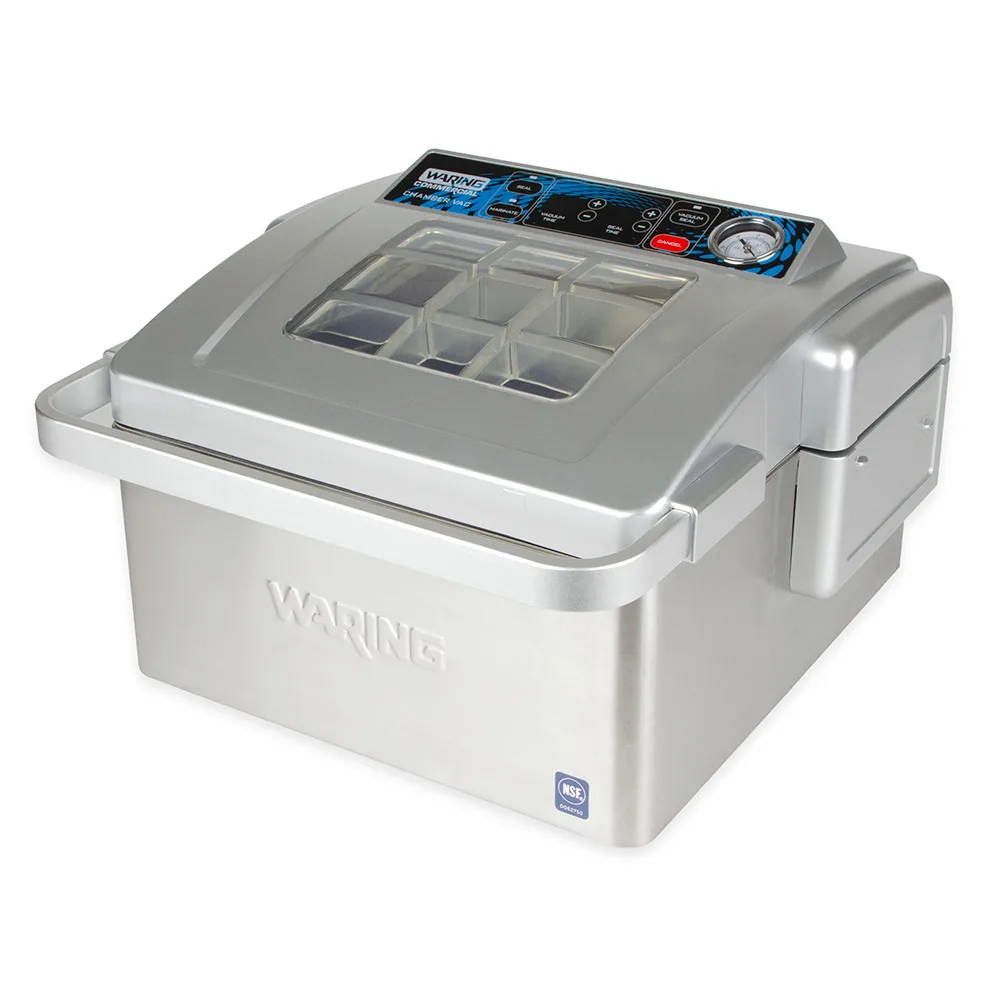 The Waring WCV300 Vacuum Sealer packaging machine has an 11-inch seal bar that double seals the bag to provide a lasting closure. With the marinating feature, meats, fruits, and vegetables can be infused with different kinds of seasonings. Operators can monitor the vacuuming process through the viewing lid, which is easy to open with its ergonomic handle. Touchpad controls streamline the process, and different-sized bags come with the unit.
