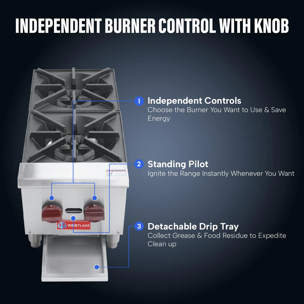 WESTLAKE EHP-2S, Commercial Gas Range 12″ 2-Burner 50,000 BTU Stainless Steel | ETL Countertop Gas Stove for Restaurant
