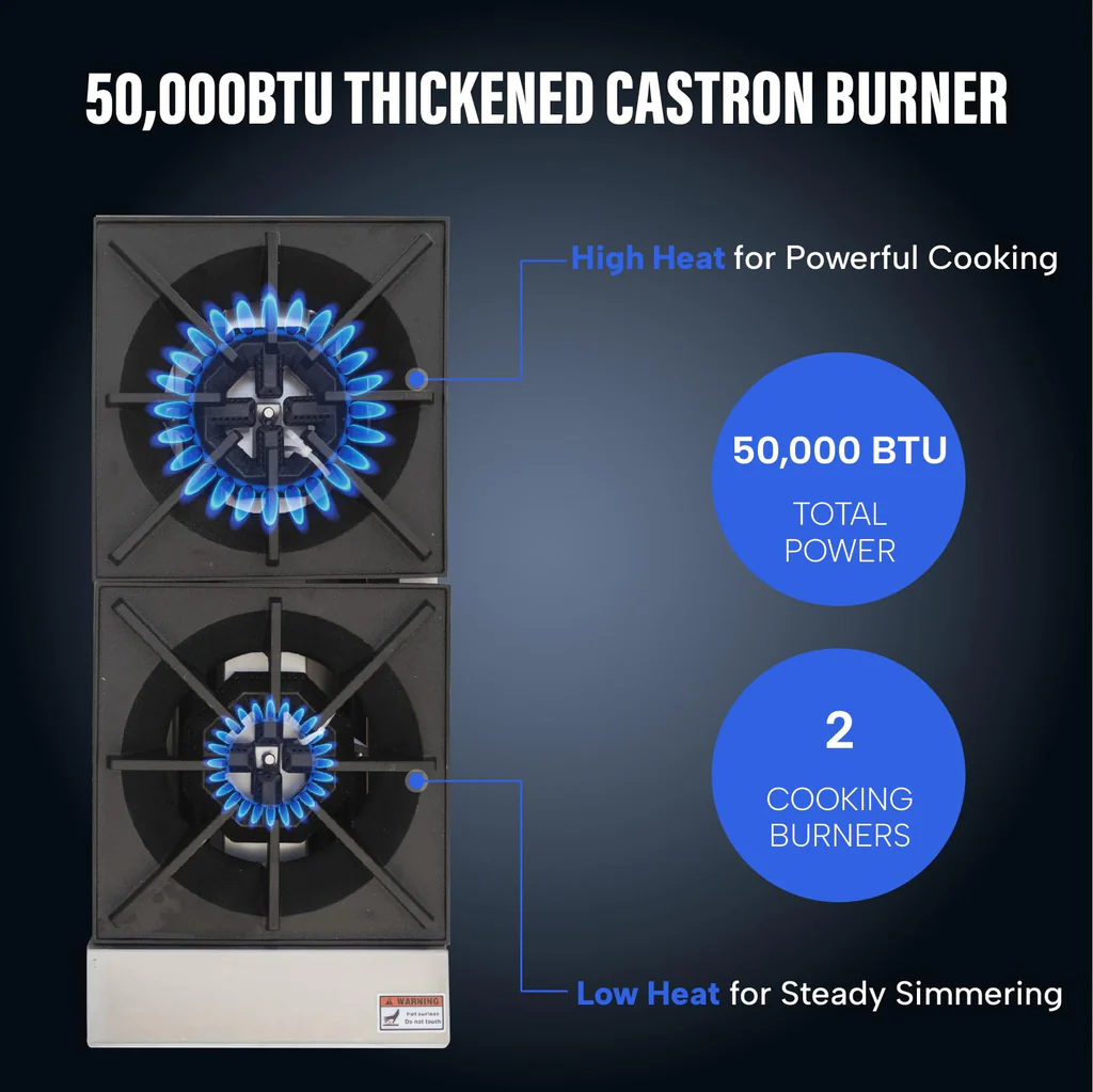 Dual High-Output Burners: Delivers a combined 50,000 BTU/Hr, ensuring rapid recovery times and versatile cooking options.