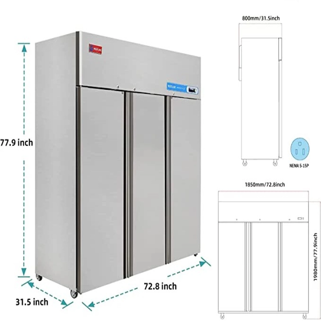 The Westlake WK-72F is the heavy-duty solution your professional kitchen needs to keep ingredients at peak freshness. This 72-inch, three-door reach-in freezer combines massive storage capacity with precision temperature control, making it a reliable workhorse for high-volume restaurants, bakeries, and catering services.